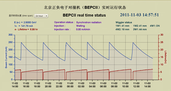 3个多月的检修中,加速器和探测器都完成了许多工程项目,特别是直线加速器和储存环,硬件的改动使加速器的调试面临不少未知数。开机后,经过各系统的紧张联调,解决了一些硬件问题,储存环进入束流参数校正、与束线联调阶段。在各系统通力合作下,开机仅一周,加速器即于11月1日早8点,正式开始新一轮的同步辐射供光运行。