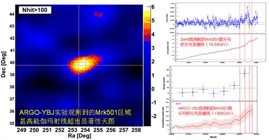 最近,中科院高能物理所羊八井国际宇宙线观测站ARGO实验观测到活动星系核Mrk501在高于300GeV能区的甚高能伽玛射线耀变,该耀变已经持续一个多月,平均流强是标准烛光蟹状星云流强的3倍,总显著性达到6倍标准偏差。期间约10天的高态,流强是其低态时的10倍,总显著性接近5倍标准偏差。