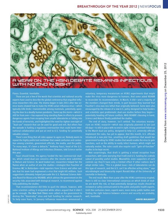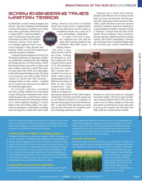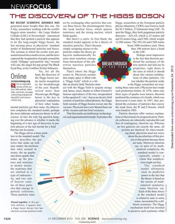 12月20日,美国《科学》杂志公布了2012年度十大科学突破,大亚湾中微子实验发现中微子第三种振荡模式的成果上榜。《科学》指出,“数百名在中国大亚湾反应堆中微子实验中工作的研究人员报告了一个模型的最后的未知参数,该模型描述了被称作中微子的这种难以捉摸的粒子在以接近光速穿行时,如何从一种类型(或‘味道’)变形为另一种类型。这些结果显示,中微子和反中微子可能会以不同的方式改变其味道,并提示中微子物理可能有朝一日帮助研究人员解释为什么宇宙含有如此多的物质及如此少的反物质。如果物理学家无法发现超越希格斯玻色子的新粒子,那么中微子物理可能会代表粒子物理学的未来。大亚湾实验的结果可能就是标志着这一领域起飞的时刻。”