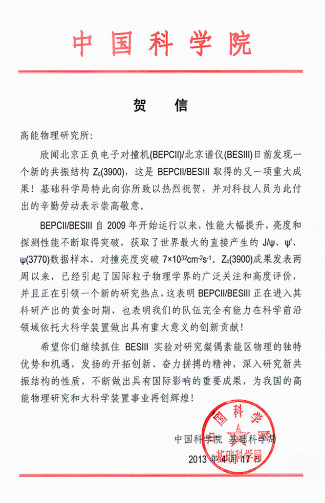 4月17日,高能所收到中科院基础科学局发来的贺信。在贺信中,基础局热烈祝贺北京正负电子对撞机(BEPCII)/北京谱仪(BESIII)取得发现新的共振结构Zc(3900)这一重大成果,并对科技人员为此付出的辛勤劳动表示崇高敬意,希望高能所抓住BESIII实验对研究粲偶素能区物理的独特优势和机遇,发扬开拓创新、奋力拼搏的精神,深入研究新共振结构的性质,不断做出具有国际影响的重要结果,为我国的高能物理研究和大科学装置事业再创辉煌!贺信全文如下: