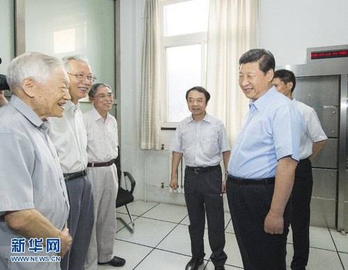 7月17日上午,习近平总书记一行来到高能所,在高能所所长王贻芳的介绍下,察看了北京正负电子对撞机、北京谱仪和北京同步辐射装置,参观了核技术应用技术成果介绍和实物样品,了解了网络和计算平台的历史和现状等,并接见了叶铭汉、方守贤、陈森玉院士。他对高能所所取得的成绩给予了高度评价。随后,在中国科学院大学召开的座谈会上,习近平总书记发表了重要讲话。他系统阐述了科学技术的本质特征和重大意义,深刻揭示了当代科技发展的现状和重要趋势,全面总结了我国科技发展的历史进程、主要经验以及当前面临的突出矛盾和问题,他要求中科院牢记责任,率先实现科学技术跨越发展,率先建成国家创新人才高地,率先建成国家高水平科技智库,率先建设国际一流科研机构。他还对高能所成立40周年表示祝贺。