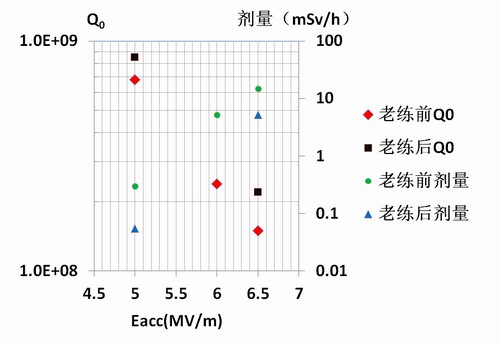 测试结果曲线(经过高频老练后Q0增加,辐射剂量下降)