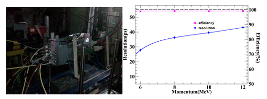 测试中的MRPC探测器及其对不同动量质子的时间分辨和探测效率