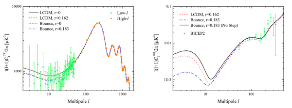 说明:以上两图给出了基本LCDM模型和最佳反弹暴涨模型预言的理论宇宙微波背景辐射功率谱以及其与PlanckBICEP2实验数据的比较