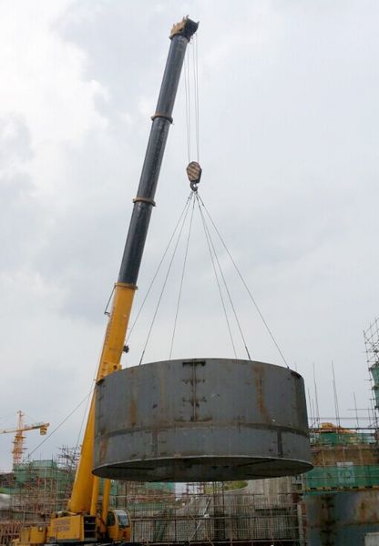 密封筒和基板是散裂中子源靶站的重要组成部分,为靶站内的设备及部件安装、固定提供稳定可靠的基础,并为靶站提供一个密闭环境,防止靶站内部活化的气体和液体向靶站谱仪大厅扩散和渗漏。密封筒由底板和筒体拼装组成,需要在施工现场制造安装。目前,已将底板与第一段、第二段筒体焊成一体,成为大型薄壁圆筒,直径9.6米,高度3.8米,总重约40吨,筒体和底板必须平稳地安装在72根锚杆上,吊装和配合的难度都很大。密封筒和基板安装由上海宝冶工程技术公司承接,参建人员充分论证了吊装方案的可靠性,做好了施工前的各项准备工作,一次吊装成功,安全可靠地完成了吊装任务。基板直径5米,安装的标高、中心位置度偏差和上平面的倾斜度都符合设计要求。