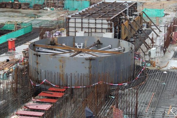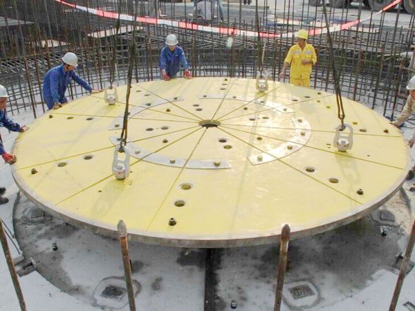 密封筒和基板分别由锚杆和地脚螺栓固定在钢筋混凝土基础上,广东省建筑工程集团承担了预埋件锚杆、地脚螺栓的安装以及浇筑混凝土的任务,预埋件的位置度偏差符合设计要求,因此保证了基板和密封筒的位置精度。