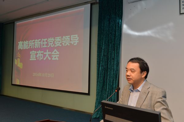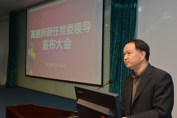 王贻芳所长代表所行政班子发表讲话。他指出,在我院积极推行“率先行动计划”的形势下,高能所面临着巨大的机遇和挑战,新一届党政领导班子责任重大。他表示,在今后的工作中,所行政与党委班子会密切合作,党政一心,与全所职工一起共同努力,将所里的工作做好,不辜负院领导、院党组的期望。同时,他也对原党委书记王焕玉、原所长陈和生的工作表示感谢,认为高能所现在的良好局面与他们打下的良好基础是密不可分的。