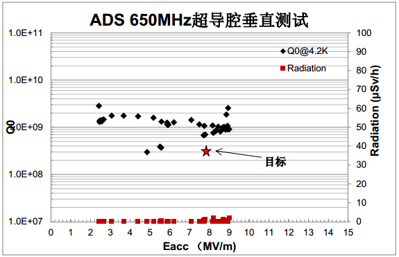 ADS 650MHz椭球腔研制是ADS先导专项中的重要内容之一。经过加速器中心ILC组与高频组的不懈努力,1月30日,完成了650MHz beta=0.82椭球腔的垂直测试,测试结果表明,该腔已经达到了设计目标,并具有较高的Q0值。在4.2K温度下加速梯度达到9MV/m,Q0为1x109 (任务书目标: 8MV/m,Q0>3x108@4.2K ),在3.3K下达到11.8MV/m,Q0为1x109。在3.3K下已达到了2K温度下的设计指标(8MV/m,Q0>3x109@2K)。这些结果标志着高能所已经掌握了650MHz中beta超导腔加工制造及后处理技术。