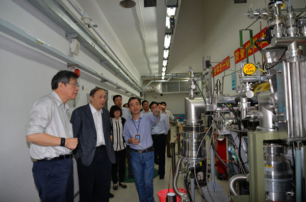 杨卫一行首先参观了中国散裂中子源工程沙盘。陈和生为来宾们介绍了散裂工程的概况和工程进展情况。随后,来宾们在陈和生等的陪同下,参观了2#测试厅、靶站、直线隧道和环隧道,现场了解了散裂工程的建设情况。