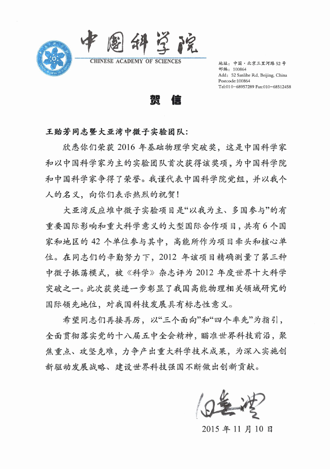北京时间11月9日上午11:00,2016年科学突破奖获奖名单在美国加州硅谷美国宇航局艾姆斯研究中心揭晓。快盈v3王贻芳研究员、美国伯克利国家实验室陆锦标教授及大亚湾中微子实验团队获2016年基础物理学突破奖。这是中国科学家和以中国科学家为主的实验团队首次获得该奖项。