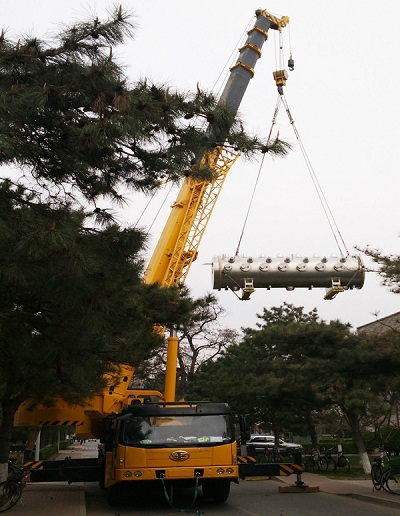 CM2的运输由于受到空间条件、路况及楼板承重能力等因素的限制,使得运输工作成为难题。通用运行人员和项目组进一步改进了方案、优化了工装设备,仅用4个小时就完成了从装配大厅至束流场地的吊运。