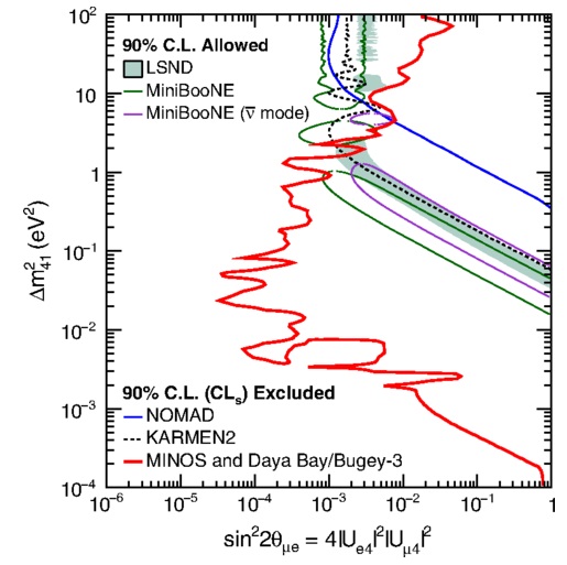 不过,来自大亚湾和MINOS的结果都不足以解决二十年来LSND实验留下的困惑,同时研究不同类型的中微子将给出更强的限制。LSND实验观察到的是缪型反中微子转变为电子型反中微子,因此,大亚湾实验和MINOS实验联合起来,同时研究这两种类型的中微子。两个大型中微子实验的紧密协作是比较少见的,但成果很显著,很有力地排除了绝大部分用惰性中微子振荡来解释LSND结果的物理模型。