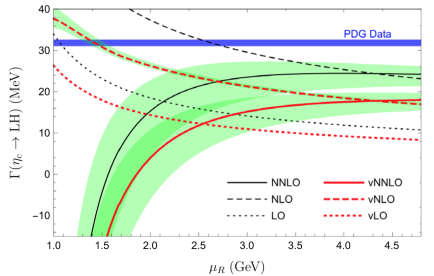 理论预言的ηc总宽度作为重整化能标μR的函数。其中LO、NLO、NNLO分别对应微扰展开领头阶、次领头阶、以及次次领头阶的理论预言。