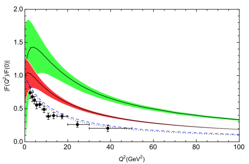 NRQCD理论预言的(归一化的)γ*γηc跃迁形状因子随动量转移Q2的变化。图中带误差的黑点代表BaBar的实验测量值。