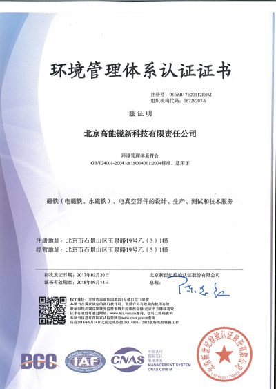 20161219日至22日,北京新世纪检验认证股份有限公司审核组对北京高能锐新科技有限公司环境管理体系和职业健康安全管理体系运行情况进行外部审核。2017220日,公司取得“环境管理体系认证证书”和“职业健康安全管理体系认证证书”。
