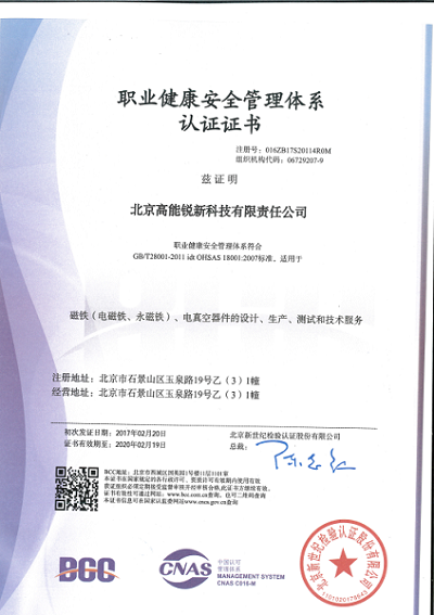 公司认证范围内的产品主要是磁铁、电真空器件。此次审核是公司2013年成立以来,在取得ISO9000质量管理体系认证证书的基础上,又同时取得了两个管理体系认证证书。环境管理体系标准主要目的就是要支持环境保护工作,使之与社会经济发展达到平衡,促进经济的持续发展。职业健康安全管理体系是以保障员工的职业健康安全和组织的生产安全为目的,为企业的安全风险管理提供坚实的保障。
