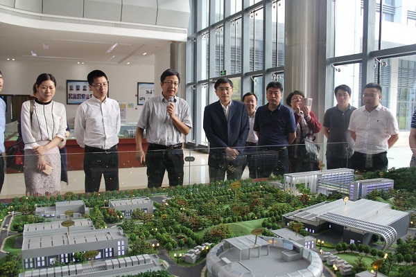 陈延伟首先在CSNS沙盘前介绍了CSNS的概况、原理和工程进展,以及项目选址的由来和国际地位。双方人员赴现场参观靶站谱仪大厅之后,举行简短座谈。田申荣提到,上海将建设具有全球影响力的科创中心,未来上海可能成为更多大科学装置的承载地,如何进行团队建设以及提供相关配套支持,CSNS有许多值得借鉴的经验。陈延伟回顾了CSNS异地建设过程中,在不同阶段面临的各种困难,以及在工程管理、人才政策以及争取地方政府支持等多方面的经验。