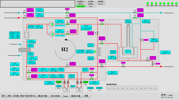 2017年1月初,CSNS低温系统完成了设备安装,并随即开始了调试工作。基于安全考虑,工作人员先使用氦气进行了五次降温测试。在调试过程中不断优化控制逻辑,确保降温过程的平稳可靠,并实现了一键全自动降温。4月开始,进行超临界氢降温测试的准备工作,包括氢系统配气排放管路的漏率检测、氢含量报警系统的校准、控制逻辑的优化等。