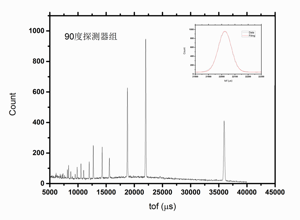 经过紧张、细致调试,至21时许,CSNS首期三台中子散射谱仪-通用粉末衍射谱仪、多功能反射谱仪(图3)、小角谱仪(图2)的主探测器和束流监视器均已首次获得在线中子信号。通用粉末衍射谱仪于21时20分开始采集标准样品硅粉末衍射数据,于21时25分观测到衍射峰,高角、90度、低角三个探测器组均采集到衍射数据,经计算未经修正的原始数据(图1),90度探测器组分辨率为0.51%。