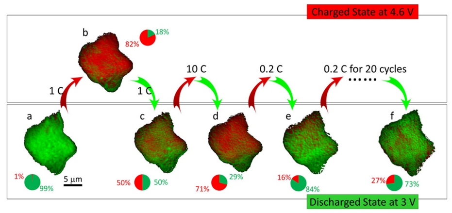图1. 原位观测单颗粒钴酸锂(LiCoO2)电池材料在23次充放电过程中随着充放电速率的不同而产生的化学价态分布信息。图中红色代表钴酸锂(LiCoO2)电池颗粒在充电状态(Co4+)下的化学价态分布信息,绿色代表钴酸锂(LiCoO2)电池颗粒在放电状态(Co3+)下的化学价态分布信息。