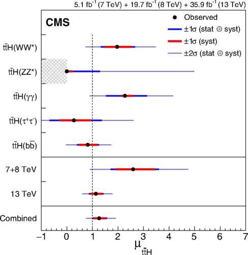 图2: CMS实验测量的ttH产生截面和标准模型预言的比较