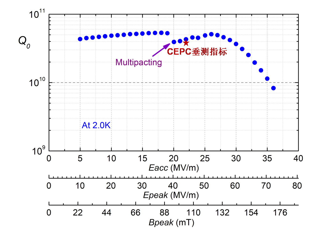 同时,在2.0K温度下,650 MHz 1-cell超导腔的加速梯度Eacc最高达到36.0MV/m,对应的峰值磁场Bpeak为171mT;加速梯度Eacc达到26.0MV/m时,Q0为5.1x1010,达到了环形正负电子对撞机(CEPC)650MHz超导腔的垂测指标要求(Q0=4.0x1010@Eacc=22.0 MV/m), 创历史新高,也与世界领先水平相当。