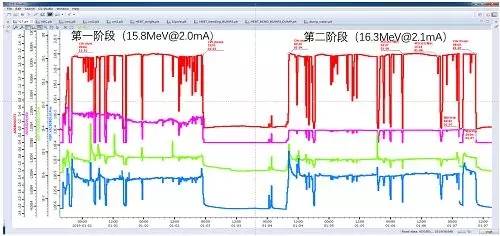 专家组一致认可该加速器取得的高功率连续束长时间运行的阶段成果:连续质子束流能量15.8-16.3MeV,束流强度2.0-2.1mA,累计运行时间达到110小时,总失束67次,平均无故障时间98.5分钟,最长无故障时间13小时37分钟,平均束流中断故障恢复时间12.2分钟,束流可用性达到89%。专家组表示,该测试结果是目前国际上连续束强流直线加速器所达到的最高束流功率和最长运行时间纪录。
