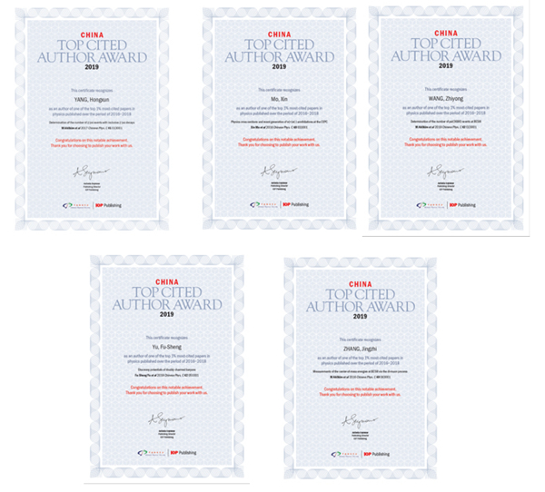 近日,英国物理学会(Institute Of Physics,IOP)发布了“2019英国物理学会高被引中国作者奖”。 Chinese Physics C上发表的五篇论文的通讯作者莫欣、杨洪勋、王至勇、张景芝和于福升入选该奖项。这五篇论文分别是: