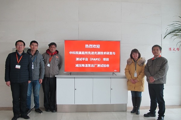 1月16日,在普旭真空设备国际贸易(上海)有限公司,来自中科院高能物理研究所和普旭公司的技术人员对北京先进光源技术研发与测试平台(PAPS)低温系统的关键设备以及2K超流氦减压降温泵组进行了出厂验收测试,测试内容包括泵组的抽速、压力稳定度、极限压力、自动控制程序和整体漏率共5个方面。测试结果显示所有技术指标均满足出厂验收要求,并定于2月运抵北京怀柔PAPS现场。