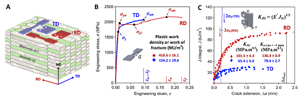 图2 (A)三维图解模型描述了样品加载方向与D&P钢组织结构的关系。(B)工程应力应变曲线。(C)J-积分阻力曲线。