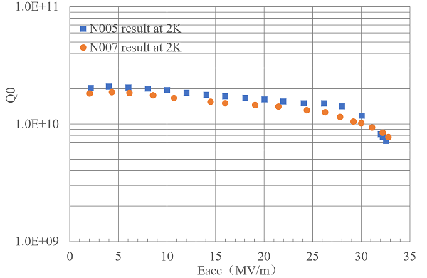 724日、30日,中科院高能所两只带端腔组件的1.3GHz 9-cell细晶粒超导腔经2K温度下测试显示:加速梯度分别达到32.8MV/m32.6MV/m,其品质因子Q030MV/m下均超过1×1010。这一测试结果是我国目前完全自主研发的细晶粒1.3 GHz 9-cell超导腔的最好结果,它实现了国内细晶粒超导腔指标跨越性进步,并与国际直线对撞机(ILC)超导腔指标35±20% MV/m28 MV/m42 MV/m@ 8×109的国际水平接轨。