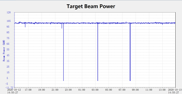 按照计划,9月15日直线加速器开始启动,9月25日加速器全面开机。随后调束人员克服硬件故障带来的不利因素,利用有限的时间对加速器进行了机器研究,在国庆中秋双节期间坚守岗位,确保按照计划10月10日开始100kW打靶运行。