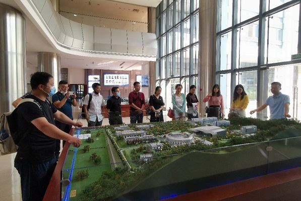 调研团首先观看了中国散裂中子源宣传片,东莞分部副主任金大鹏结合沙盘对中国散裂中子源进行了深入浅出的介绍,并带领杨萃等参观了园区和加速器中控室。调研人员表示被“国之重器”中国散裂中子源大科学装置的魅力震撼,感受到了整个建设运行团队的蓬勃朝气和十足干劲。调研团随后参观了中科院“党员主题教育基地”和“BNCT”实验装置。