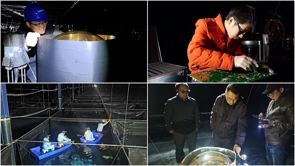 WCDA水池采用了特有的薄壁混凝土现浇边墙+软基土工膜防渗系统+大跨度轻钢屋面结构设计,国内首创,国际领先。在没有国标可参考的情况下,实现了探测器设计对避光、防冻、防锈蚀和水位保持等所提出的超标准指标要求。WCDA探测器研制与安装团队在气候条件极为恶劣的冬季完成了号、二号水池的安装任务,在新冠疫情期间(20203月份)就率先抵达安装现场,在高原缺氧、高寒和重湿度等严苛工作环境下,于202010月底按期完成了全部探测器的安装调试工作,并及时进入注水阶段。三个水池共35万吨净水的注水都是在冬季缺水但水质良好的条件下完成,运行人员克服了夜里零下20多度的极大困难,保证的原水的稳定供给和净水备制逾3000小时。