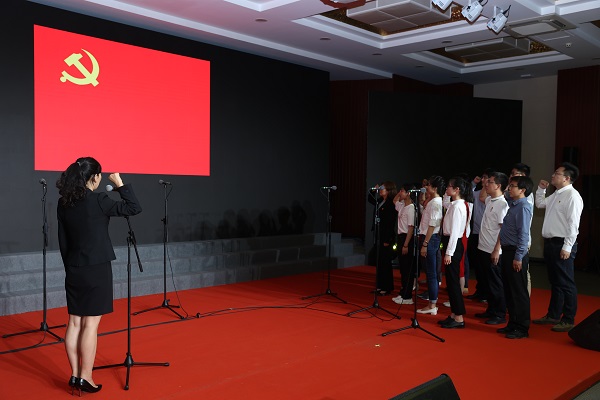 会上,14名新党员进行了入党宣誓,东莞研究部齐欣,多学科中心张兵兵代表新党员上台讲话。