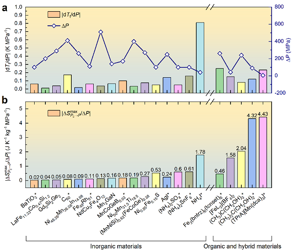 图1. NH4I的相变温度压力敏感性、饱和可逆驱动压力和压卡强度等与其它压卡材料的对比。