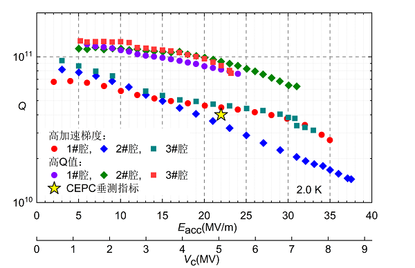 在中科院高能所射频超导与低温研究中心的部署下,负责CEPC 650MHz超导腔研制任务的沙鹏等人经过多年的不懈努力,CEPC 650 MHz高性能超导腔在国内首次成功实现了大尺寸(频率小于1GHz)超导腔的中温退火、电化学抛光等多项关键技术,从2021年底至今,已在多只650 MHz single-cell超导腔样机上获得成功,取得了优异的垂直测试结果(@ 2.0 K):经过高加速梯度工艺处理后,3只650 MHz single-cell超导腔的加速梯度均超过了30 MV/m,最高达到了37.5 MV/m;而经过高Q值工艺处理后,在22 MV/m的加速梯度下,3只超导腔的Q值均超过了8×10^10,比CEPC的垂测指标(4×10^10)高出了一倍以上。