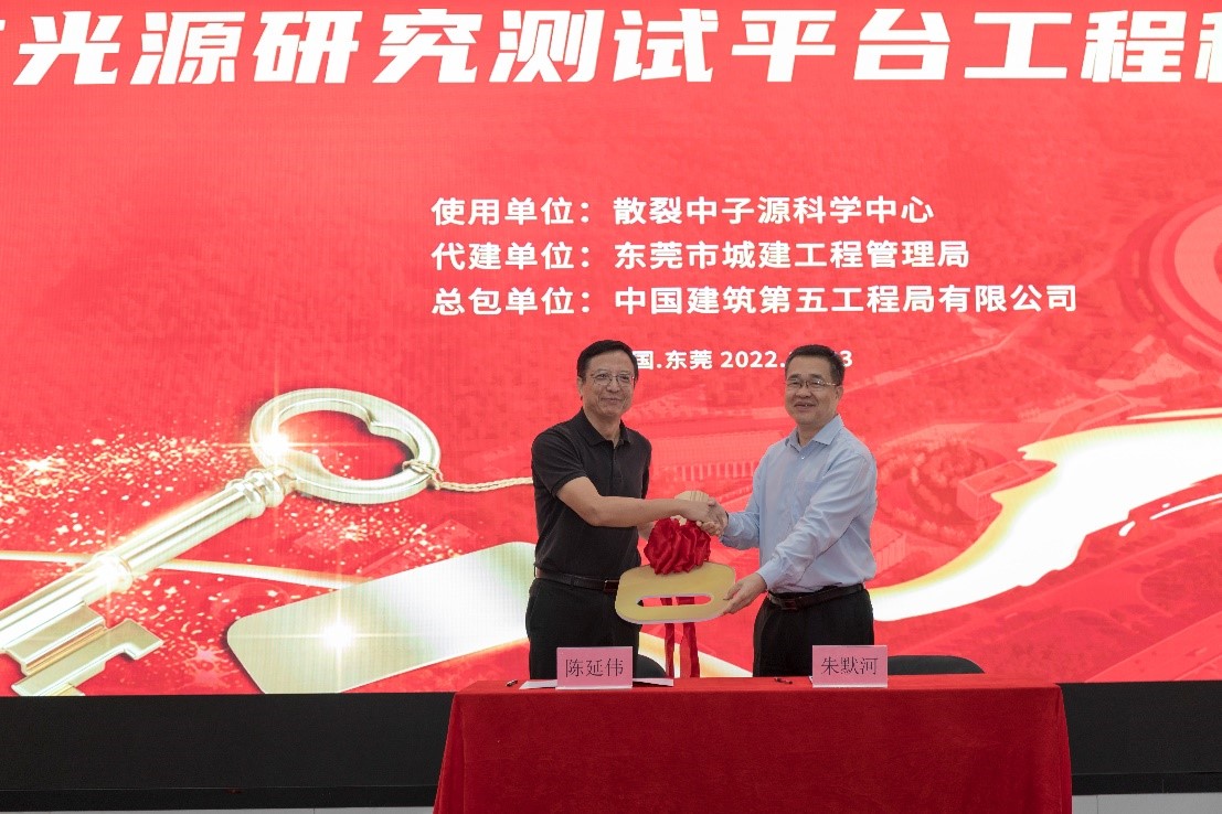 11月3日,南方光源研究测试平台举行工程移交仪式,这标志着该平台正式投入使用。高能物理所副所长陈延伟、东莞市城建工程管理局局长朱默河、中国建筑第五工程局有限公司东莞分公司党委副书记康娜等有关单位负责人参加了活动。