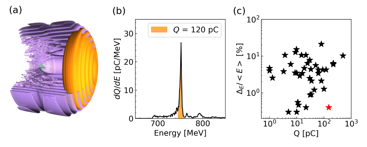 (a) 激光干涉形成的多壳层周期性空泡结构。橙色代表激光脉冲,紫色代表背景等离子体,青色代表被俘获的电子束团;(b) 电子束团能谱;(c) 激光干涉注入机制产生的电子束(红色)品质与其它已发表权威结果的比较(黑色)