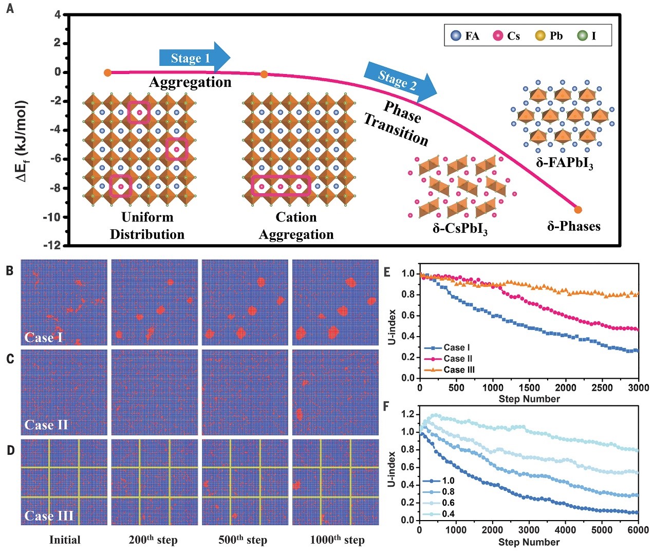 图1. 钙钛矿薄膜相分离的理论计算和钙钛矿薄膜老化过程的谢林模型模拟。