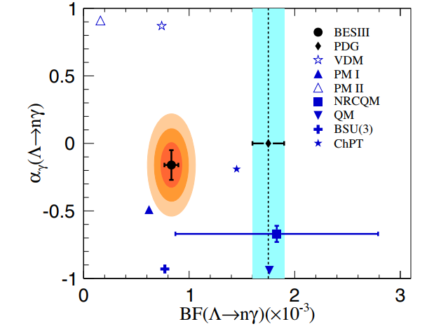 Λ超子是含一个奇异夸克的重子,就是把中子内部一个下夸克替换成奇异夸克。Λ超子是重子八重态中含奇异夸克的最轻重子,是最早在宇宙线实验发现的长寿命超子,历史上研究其衰变性质对弱相互作用理论的发展起到了重要作用。超子的衰变主要包括三类:强子衰变、半轻衰变以及辐射衰变。其中超子的辐射衰变是唯一包含了电磁、弱和强三种相互作用的过程,是研究低能区相互作用的理想场所。 1957年,李政道和杨振宁对超子衰变过程的分波振幅做了首次研究[1],并对衰变振幅过程进行了参数化,其中的衰变不对称参数a表征超子衰变中宇称破缺和宇称守恒振幅的比例,在辐射衰变中也描述了末态辐射光子的自旋极化。Λ超子辐射跃迁到中子是奇异数改变的过程,日本理论家Yasuo Hara考虑到SU(3)味对称性破缺后,预言了辐射光子的自旋极化行为[2],该理论被称为Hara定理。然而在