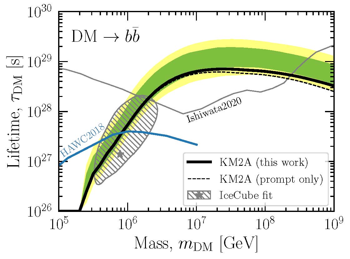 LHAASO对超高能伽马射线具有前所未有的高探测灵敏度,为研究质量超过 100 TeV 的重暗物质提供了独特的可能性。研究人员利用LHAASO在 570 天运行中KM2A子阵列获得的数据,测量了银河系盘面以外100 TeV以上伽马射线的强度,以最优的观测灵敏度,对这类暗物质的寿命做出了迄今最强烈的限制,比已有结果提高了近10倍。此项研究表明,PeV 质量暗物质寿命至少为十万亿亿年(10^21年)。LHAASO对伽马射线的观测,与其它寻找暗物质的实验(如中微子观测实验)有很强的互补性。随着LHAASO全阵列稳定运行,数据逐渐积累,将进一步提高这一限制。