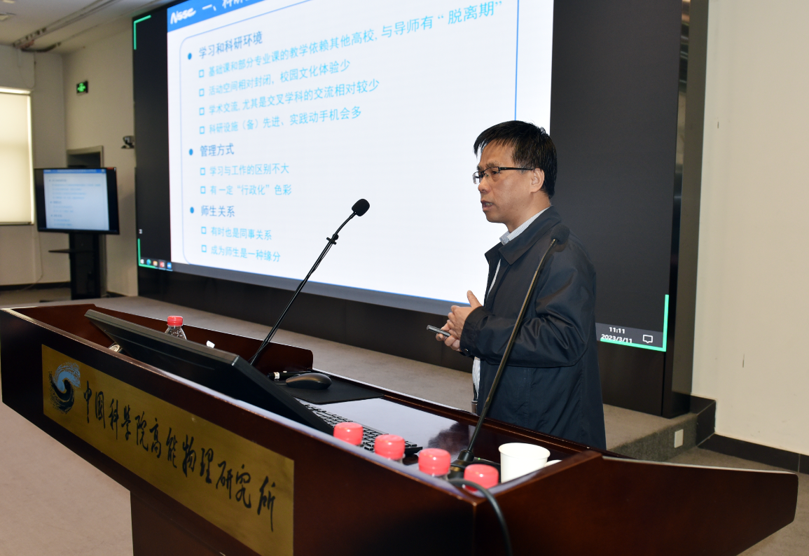 高随祥做了题为《守正尽责,全面育人--导师在研究生思政工作中的作用》的报告,从教育的根本问题“培养什么人、为谁培养人、怎样培养人”为切入点,结合国科大 “大思政”体系对导师的要求,通过生动案例级自身感受讲述了“如何成为一名好导师”,并指出“把研究和育人都做好,是一名学者职业生涯最大的成功”。乔晗在《提高人才培养质量,实现内涵式发展》的报告中,对国科大一流学科建设、培养质量提升和学位质量控制进行了全面介绍,让导师们对国科大学科布局、研究生培养质量和学位论文质量把控有了政策和方法指导。冉盈志介绍了当前研究生招生的情况和相关政策,结合实际案例明确了招生工作中的注意事项,同时宣贯了2023年最新招生政策改革情况。陈祉妍以《培养和谐师生关系 促进学生健康成长》为题,以调研数据展示了我院研究生心理健康状况,分析产生心理原因的主要原因,并对师生之间如何更好的理解与沟通给出了指导意见,强调真诚、关注、共情的作用。邢志忠研究员和张云华研究员分别从不同切入点分享了多年指导研究生的心得和体会,对如何处理师生关系、促进学生各个阶段的成长提出了宝贵的建议。李玲研究馆员作了题为《弘扬科学精神 恪守科研诚信》的报告,介绍了科研诚信、学位不端和学术规范的基本要求,结合多个真实案例,对学术不端行为进行了深入全面的探讨。