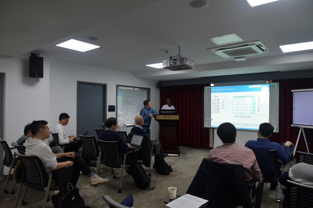 上午的讨论分别由高能所李卫东和山东大学黄性涛主持。高能所陈莹首先致辞欢迎,简单介绍了量子计算的应用,并对本次讨论会寄予期许。中科大上海研究院的吴玉林、本源量子的李蕾以及北京量子信息科学研究院的王正安分别介绍了各自的量子计算机进展、量子计算平台和量子计算生态建设等。高能所毕玉江介绍了高能所量子计算平台的建设与规划,北京大学周辰和山东大学李腾分别介绍了量子计算在 LHC 和 CEPC 数据分析和高能物理数据处理中的应用研究,曲靖师范学院的章宇介绍了量子机器学习算法的优化研究。