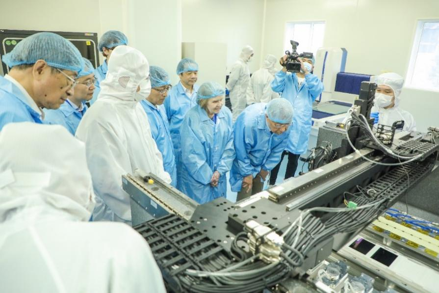 会议间隙,丁肇中教授在王贻芳和陈和生的陪同下参观了实施AMS升级硅探测器模块研制工作的3号厅半导体实验室,听取了王建春研究员对实验室的详细介绍,并细致地观察了模块研制的工作流程,丁肇中教授对高能所开展的相关工作和技术能力表示肯定。来自国外的合作者也参观了实验室并对模块研制的技术细节进行了充分的交流与讨论。