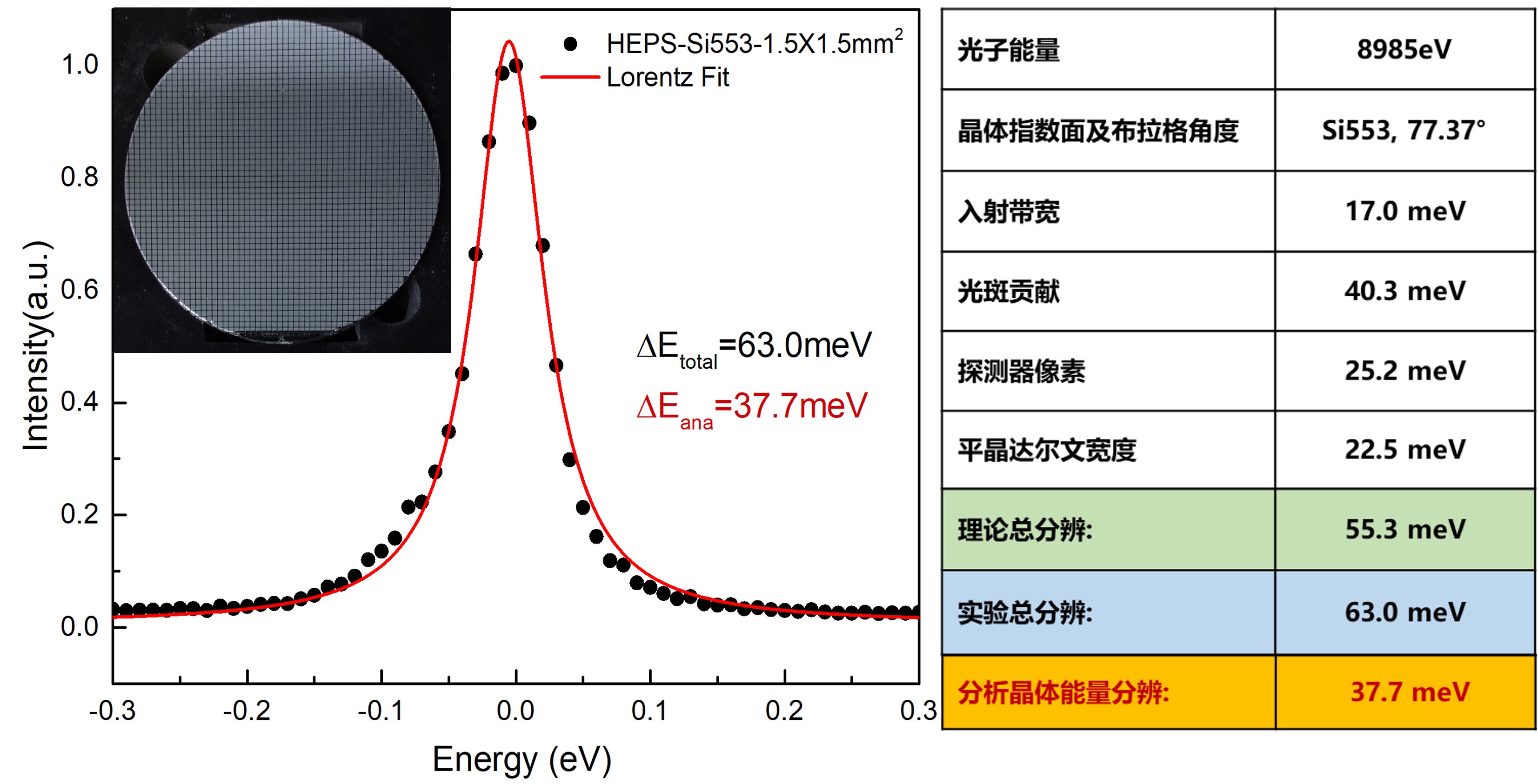 RIXS分析晶体的在线表征是检验分析晶体品质的关键步骤。2023年5月,高分辨谱学线站团队包括徐伟研究员、郭志英副研究员、张玉骏副研究员、靳硕学副研究员等通过与日本超级环光源-日本量子科学技术研究开发机构线站(SPring-8-QST-BL11XU)的Kenji Ishii(石井贤司)教授合作,顺利完成了RIXS分析晶体的在线表征。曲率半径2米的单晶硅(553) RIXS分析晶体,实测分辨达到37.7meV (FWHM)@8985eV。这一结果表明,HEPS团队已具备RIXS分析晶体自主研制能力。