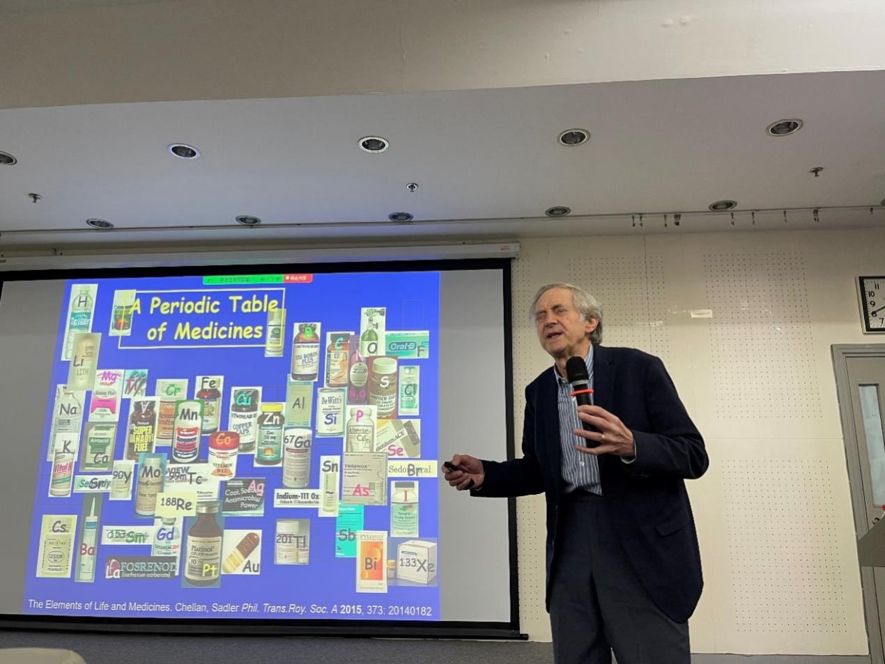 Sadler教授从周期表中与生命相关的元素出发,对金属药物的设计合成、抗癌机理、体内运送及与生物分子相互作用等方面做出了详细介绍,整场报告深入浅出、生动幽默。报告结束后,Sadler教授与在场人员进行了深入的交流讨论。在访问期间,Sadler教授还参观了北京正负电子对撞机、北京同步辐射装置、空间多组学质谱平台和高能同步辐射光源。