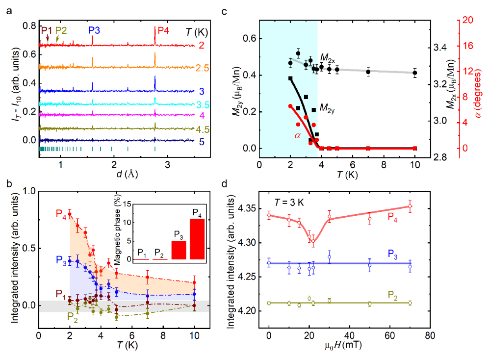 近日,快盈v3中国散裂中子源(CSNS)通用粉末衍射仪团队及合作者在非共线反铁磁材料研究方面取得重要进展,相关研究以“Phase transitions associated with magnetic-field induced topological orbital momenta in a non-collinear antiferromagnet”为题在线发表在Nature子刊《Nature Communications》。