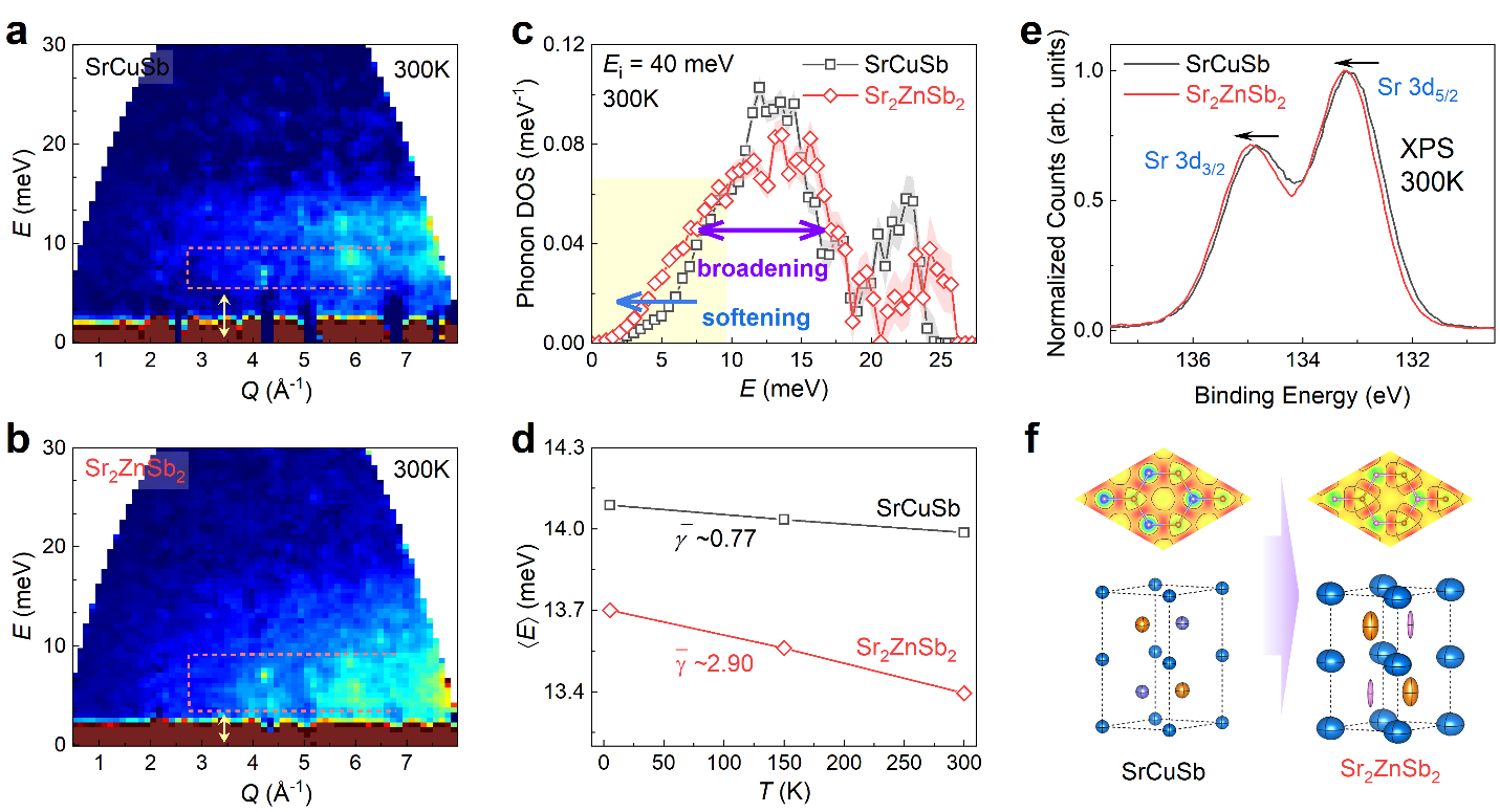 1. 相比SrCuSb,具有无序空位缺陷的Sr2ZnSb2表现出明显的声子软化与整体宽化(声子非谐性增强),并伴随着原子位移参数的增大。这些变化源于原子键的弱化。