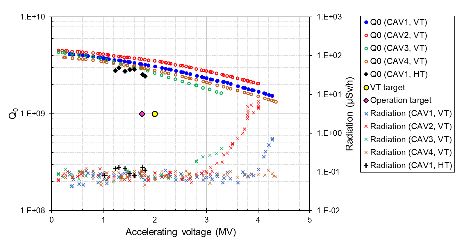 测试结果表明:在4 K温度下,加速电压在1.75 MV时(HEPS运行值),500 MHz超导模组的品质因数达到2.6E+9,模组的静态热负载为20.3 W,动态热负载为12.8 W,无场致发射,未发现腔内二次电子倍增效应。受测试功率源最大功率限制,模组测试时最高腔压为1.81 MV,对应耦合器连续波功率155 kW,场致发射引起的最大剂量值小于0.1 μSv/h,与裸腔垂直测试水平相当。